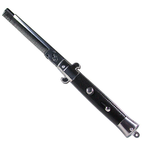 A true greaser's weapon of choice is his SWITCH BLADE COMB! When your pomp or DA needs a bit of fixin' just draw your SWITCH BLADE COMB and swing into action. This is a quality reproduction that works and looks just like a switch blade only it's a pocket size comb for the greaser on the go. 5" when closed and 9" when extended. Can be attached to chain or key ring. Used in Broadway shows as a switch blade prop.